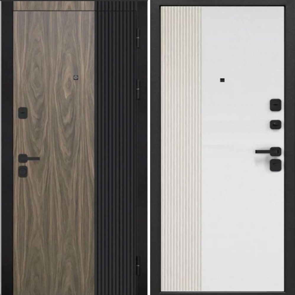 Металл: Порошково-полимерное покрытие, цвет Муар черный Отделка снаружи: лист стали, двухцветная ламинированная МДФ панель 12мм, цвет Орех Американский мокко + Антрацит софт